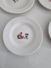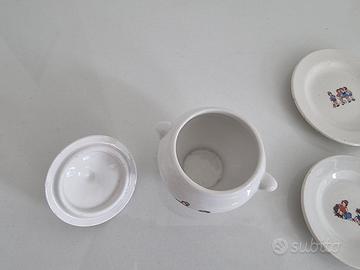 Servizio da tavola giocattolo anni '30, manifattura ceramica Laveno, composto da zuppiera, insalatiera, due piatti da portata, una fondina, quattro piatti piani. decorato con scenette che hanno bambini come protagonisti. Sono presenti alcune piccole fratture e segni del tempo.