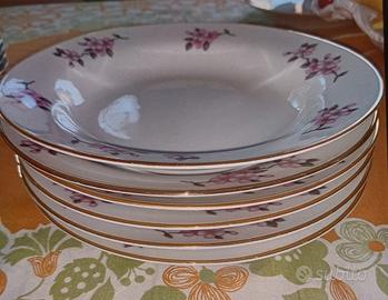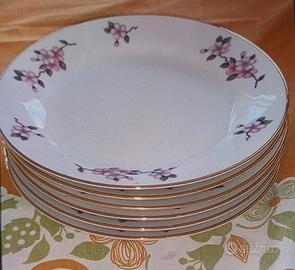 Servizio di piatti 6 fondi 6 piani 6 piccoli Salsiera 2 piatti da portata Con disegno floreale e bordo in oro.