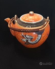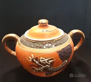 "Raffinato Servizio da Tè Giapponese vintage, stile Dragonware Moriage, in porcellana sottile 'guscio d'uovo'. Il set, di un vivace colore arancione bruciato con decorazioni a drago in rilievo e finiture oro, è arricchito dalla suggestiva Litofania Geisha sul fondo delle tazze (l'immagine della Geisha appare in controluce). Ottime condizioni."