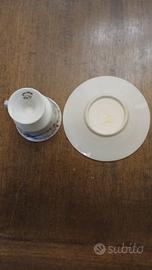 ervizio da tè vintage con marchio Edelweiss Qualitat. Il marchio raffigura una stella alpina stilizzata circondata da una raggiera, con le scritte "EDELWEISS" sopra e "QUALITAT" sotto, un timbro tipico di produzioni europee della metà del XX secolo. Caratteristiche del Set Stile: Il decoro è composto da piccoli fiori rosa e rami con foglie verdi che corrono lungo i bordi, uno stile floreale classico molto comune nelle porcellane vintage degli anni '50-'70. Materiale: Porcellana bianca di qualità, spesso associata a manifatture tedesche (come quelle della regione della Baviera) o europee che utilizzavano marchi di garanzia di qualità generici. Manza purtroppo un piattino.
