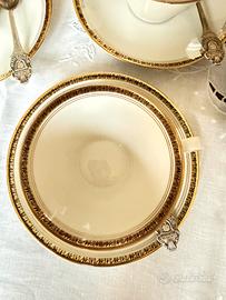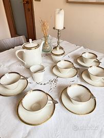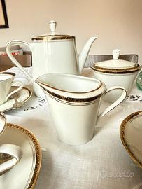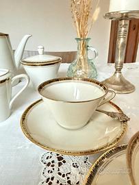 Servizio da the in fine porcellana, con bordi decorati a motivi greci su sfondo in oro zecchino 24kt, per 6 persone. Schaller Bavaria del 1960. Il servizio è in ottime condizioni. Composto da: - 6 tazze (10x7 cm) - 6 piattini (15 cm) - Teiera 19x25x9cmq - Lattiera e zuccheriera. Per ulteriori foto scrivere in privato. Possibilità di accordarsi per il ritiro di persona.