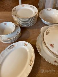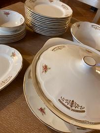 Il set include diversi pezzi, 6 piatti piani piccoli, 6 piatti piani e 6 fondi, una zuppiera con coperchio, una insalatiera, 1 vassoio ovale, un vassoio rotondo, una ciotola.