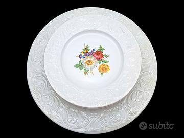 Splendido servizio da torta / dolce della storica manifattura Laveno (gruppo Richard Ginori). Il servizio appartiene alla celebre serie "Rinascimento", riconoscibile per l'elegante bordo lavorato a rilievo con volute bianche e il classico decoro floreale policromo al centro.
