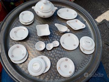 Servizio da tavola in miniatura in ceramica con decori in oro della Richard primi '900 completo di 12 piattini (6 piani e 6 fondi) con 3 piatti da portata, salsiera, piatto antipasti, insalatiera e zuppiera completa di coperchio!