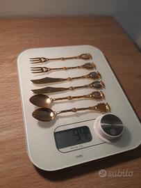 Elegante set di posate vintage composto da 6 pezzi (2 cucchiaini, 2 forchettine, 2 coltellini) con finitura dorata e inserti in Argento non punzonato. Il set presenta una raffinata lavorazione barocca ed è conservato nella sua custodia originale in velluto azzurro "Container Linea 2000 - Brevettato".