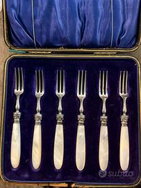 set di posate nell'immagine è un servizio da dolce o da frutta antico, caratterizzato da manici in madreperla e parti metalliche solitamente in argento sterling o in Sheffield (metallo placcato argento).