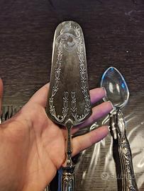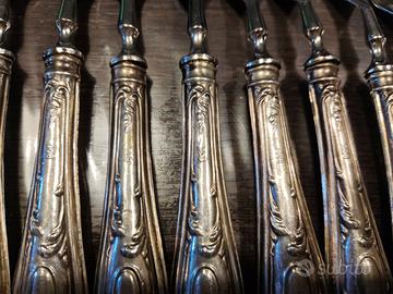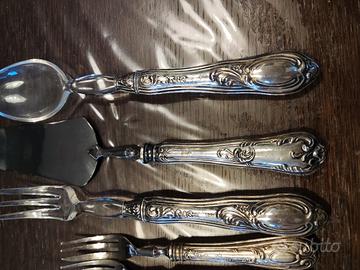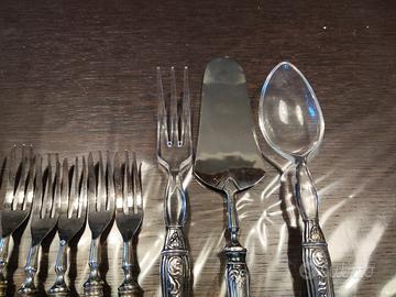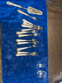 composto da 12 forchette da dolce più paletta con manici in argento 800 e parti superiori in acciaio, e due posate da portata con manici in argento e parti superiori in plexiglass . condizioni ottime, fornita custodia in panno antiossidante. NO CONSEGNA A MANO SOLO SPEDIZIONE