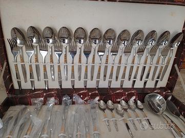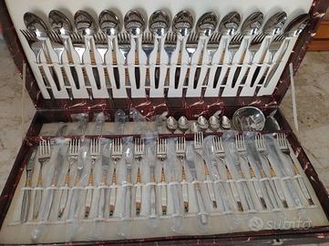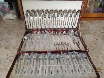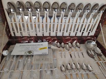 Elegante Set di posate nuove Gottinghen da 75 pezzi, per 12 persone, vintage anni '80 in acciaio 18/10 laminate in oro zecchino 24 carati; con certificato di garanzia e scatola originale in discrete condizioni. Nuovo mai usato in confezione originale, il set non è mai stato pulito e i coltelli sono ancora imbustati. Ideali per appassionati di collezionismo e per arricchire la tavola di tutti i giorni o per le occasioni speciali. Modalità di consegna: Disponibile per ritiro a mano a Macerata (MC) e Ancona (AN) e spedizione in tutta in Italia Primo contatto tramite chat