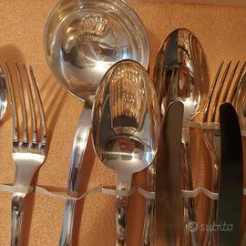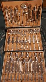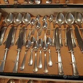 Servizio di posate placcate argento 800 anni 40 da 12 persone. Completo di set frutta dolce e cucchiaio da te oltre a mestolo forchettone e cucchiaio da cucina. Totale 120 pezzi. Confezione originale mai usato.