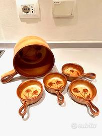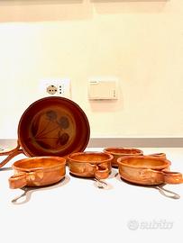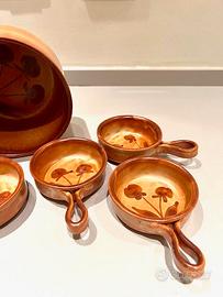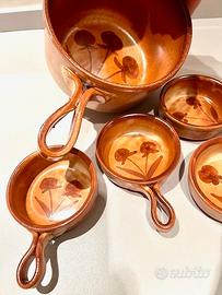 Servizio Ramekin Originale Anni 50. Perfettamente conservati, in condizioni impeccabili. In terracotta smaltata, con un fine disegno floreale dipinto a mano. I ramekin sono piccoli contenitori, adatti al forno e resistono alle alte temperature, rendendoli ideali per piatti come soufflé, crème brûlée, sformati, budini e contorni. I 4 rameking e la propria pentola ne fanno un servizio unico e difficile da reperire. Diametro pentola: 18 cm e altezza 14 cm. Diametro singolo rakemin 10 cm e altezza 4 cm.. Bello da possedere, da utilizzare, da esporre ma anche da regalare. Bellissimo.