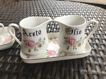 - Due anforette decorate in stile floreale una per l'aceto e una per l'olio con vassoio.