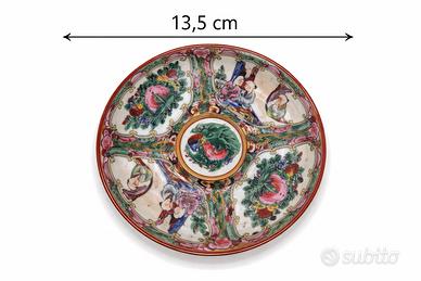 Servizio composto da 5 tazzine da tè/caffè in porcellana decorata stile orientale (tipo Canton/Cina), riccamente decorate con motivi floreali e scene figurative. • 4 tazzine in buone condizioni generali • 1 tazzina presenta una crepa interna riparata/incollata (visibile in foto), comunque stabile ed espositiva • Leggeri segni del tempo coerenti con l’età • Decorazioni vivaci e bordi dorati 💡 Ideali per collezionismo, esposizione o uso decorativo