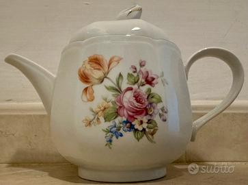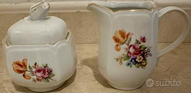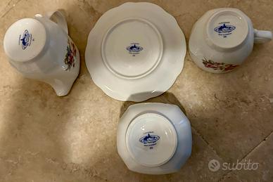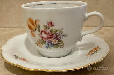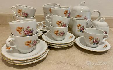 Bellissimo set vintage da caffè decorato a mano da 12 con teiera, lattiera e zuccheriera in porcellana finissima leuchtenburg. Decoro floreale con bordino oro 24 kt. Il set è' nuovo e si trova in ottime condizioni ogni pezzo è marchiato come da foto. La tazza ha diametro 9 cm ed altezza 7 cm, la teiera è alta con coperchio 18 cm ed ha diametro massimo 15 cm. Il tutto sarà accuratamente imballato e spedito.