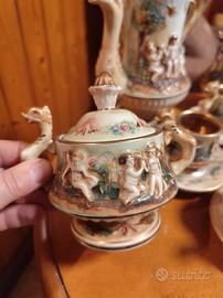 Elegante servizio da tè o caffè in ceramica di Capodimonte, finemente decorato con scene figurative.