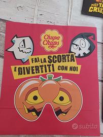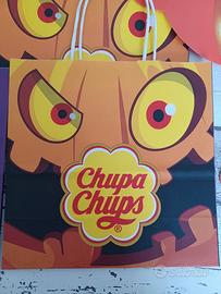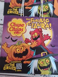 Set di 12 borse di carta a tema Halloween, perfette per raccogliere dolcetti o come decorazione. Presentano grafiche colorate con personaggi Chupa Chups e Kinder.