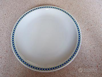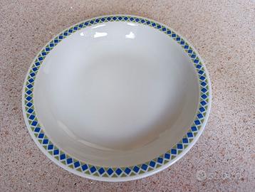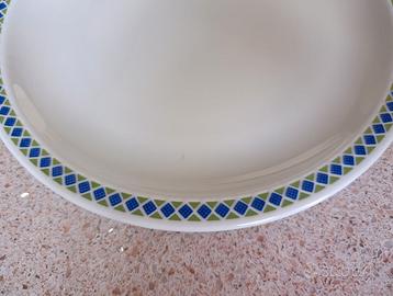 Colore bianco, con greca verde e blu sul bordo. Prezzo 54 euro, spedizione esclusa.