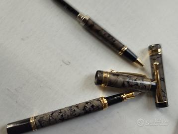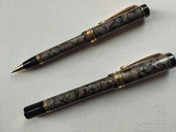 Elegante Set vintage di penne da collezione anni 90 in resina marmorizzata grigio e nero con effetto venato