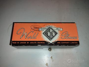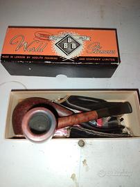 Set vintage di pipe. Include due pipe in radica in diverse forme/dimensioni e accessori (probabilmente un sacchetto in velluto e attrezzi). Oggetto da collezione, ideale per appassionati di pipe storiche o come elegante arredo vintage. Scatola esterna originale (arancione e nera) in condizioni accettabili ma integra. Le pipe presentano i segni d'uso normali per l'età.