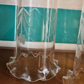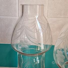 Set di 3 paralumi in vetro soffiato per lampada a petrolio o a olio, tutti identici e in buone condizioni. Caratterizzati dal tipico bordo inferiore arricciato/smerlato e dalla forma a campana con collo stretto, compatibile con bruciatori standard d'epoca. Caratteristiche principali: ►Tipologia: paralumi per lampada a petrolio/olio (3 pezzi) ►Materiale: vetro soffiato trasparente con incisioni a bulino ►Decorazioni: motivi floreali con foglie pendenti e bacche ►Base: bordo smerlato/arricciato tipico dei paralumi d'epoca ►Apertura superiore: 4,5 cm (compatibile con bruciatori standard) ►Dimensioni: 26 x 11 cm cad. ►Condizioni: Ottime Vendibili anche singolarmente!