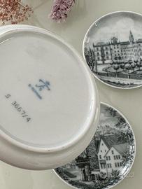 Set di tre sottobicchieri/piattini vintage in ceramica tedesca bavarese, ciascuno decorato con uno scorcio monumentale della città di Coburg. Diametro 10 cm, ideali come decorazione, svuotatasche o base per tazzine. In perfette condizioni, senza scheggiature.