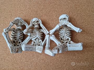 Vendo trio di statuette in resina effetto anticato, molto decorative e originali. Ogni scheletro rappresenta una delle tre pose classiche.
