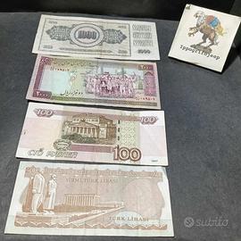 Set 4 banconote rare, 1000 dinari Jugoslavia, 2000 rial Iran, 100 rubli Russia e 20 lire Turchia.