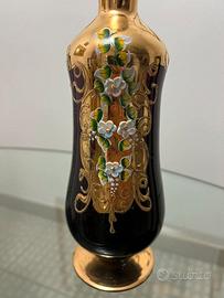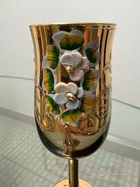 Rarissimo e antico servizio da 4 bicchierini per rosolio/liquore + bottiglia in Vetro di Murano degli anni ‘40-50 realizzato da maestri vetrai veneziani con la tecnica dei “Tre Fuochi” (tre fiamme). Originario della ricchezza veneziana del XVIII secolo, questo metodo era popolare tra i ricchi della città e tra coloro che provenivano dall’estero che volevano stupire i loro ospiti. Il processo “Tre Fuochi” è lungo e laborioso perché richiede l’applicazione manuale di smalti e foglie d’oro 24 carati sulla vetreria.