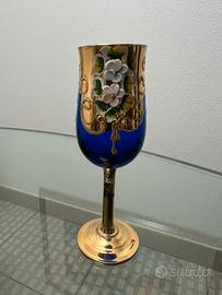 Difetti: trattandosi di un servizio vintage presenta lievi segni di utilizzo su alcune parti in oro 24 kt e alcune scheggiature sui decori floreali di due bicchierini, come in foto, che ne hanno determinato la valutazione al ribasso.