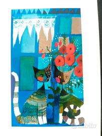 Set di 4 cartoline artistiche di Rosina Wachtmeister, celebre per la sua iconografia giocosa e colorata, in particolare per i gatti stilizzati. Le cartoline sono incorniciate all'interno di una cornice in legno dorata e vetro che misura 46 x 36.5 cm. Le cartoline sono inserite in un passepartout di cartoncino nero. Secondo una ricerca online, furono realizzate tra la fine degli anni '80 e la metà degli anni '90, periodo di massima diffusione delle sue opere in formato cartolina e da collezione, come suggerito anche dalla data "1995" visibile su una delle cartoline. Lo stile è caratterizzato da colori intensi, come il blu cobalto, il rosso e il turchese, e linee che evocano un'atmosfera fiabesca. Ogni cartolina è caratterizzata dall'utilizzo di inserti metallici, che appaiono brillanti, "argentati" e dorati. Sono ottenuti tramite stampa a caldo con lamina, con una sottile pellicola metallizzata. Le 4 cartoline sono verticali: in alto a sinistra troviamo l'Arlecchino Azzurro, che celebra la gioia; in alto a destra sono raffigurati I Musicisti (Flautisti), che suonano strumenti a fiato dorati; in basso a sinistra si riconosce il classico Gatto con Fiori Rossi; e infine, in basso a destra, il Gatto sulla Sedia (La Sedia Blu). Ottime condizioni generali. Per la spedizioni suggerisco una spedizioniere tipo BRT viste le dimensioni (sarà più grande della attuali dimensioni per via dell'imballaggio). Disponibili altre foto.
