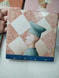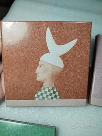 In vendita splendido set di 4 mattonelle d'arte in terracotta smaltata, prodotte dalla celebre manifattura Cotto Fiorentino.Le opere presentano i caratteristici profili onirici e metafisici attribuiti al design di Riccardo Biavati, con figure dai copricapi fantasiosi che richiamano l'estetica del Rinascimento italiano in chiave surrealista.Ideali come. elementi d'arredo per una cucina ricercata, come sottopentola artistici, o da incorniciare come piccoli quadri da collezione.Vendibili anche singolarmente .sono tutti in condizioni pari a nuovo tranne uno .A disposizione per ulteriori foto