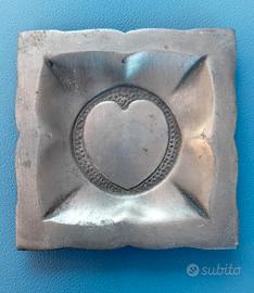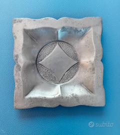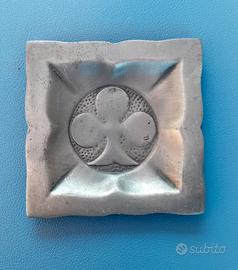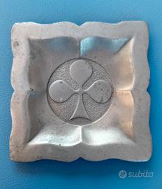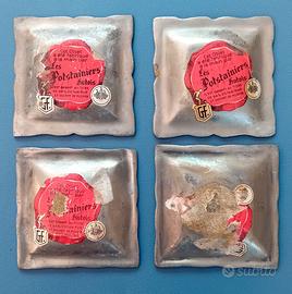 Set di 4 posacenere in peltro con i semi delle carte da gioco del poker con i simboli delle picche, cuori, quadri e fiori. Il set di 4 portacenere dovrebbe risalire tra gli anni '50 e '70. Sul retro si notano le etichette della casa produttrice belga "Les Potstainiers Hutois", specializzata nella produzione artigianale di oggetti in peltro, in particolare in stile Art Nouveau e Liberty. I portacenere, cosi come tutta la loro produzione, era caratterizzata dalla realizzazione di oggetti al 94% di peltro puro. L'azienda oggi non esiste più e ogni oggetto con il loro marchio è ormai fuori produzione. Ogni posacenere misura 8 X 8 cm (circa) ed ognuno pesa 94 grammi. Le condizioni sono come da foto, portano i segni del tempo, dell'utilizzo e della conservazione. Sul retro si notano le etichette della casa produttrice, e solo in un uno dei 4 posacenere l'etichetta è quasi mancante.