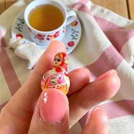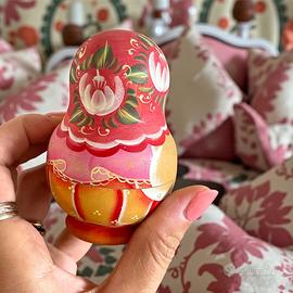 ✨ Cinque volti, una sola storia. Dietro ogni matrioska si cela un piccolo universo, e questa — realizzata nel 1996 — racchiude la delicatezza dell’artigianato russo dipinto a mano. La più grande, con la sua ciotola e l’uccellino rosso, sembra accogliere le “sorelle” più piccole in un abbraccio silenzioso, come in una fiaba tramandata attorno al fuoco. Le linee morbide, i colori vivaci e le sottili dorature raccontano una tradizione che attraversa generazioni. Sul fondo, la firma Protsenkova (cognome femminile) sigilla l’opera: una mano femminile che, quasi trent’anni fa, ha dato vita a queste figure con pazienza e poesia.