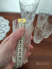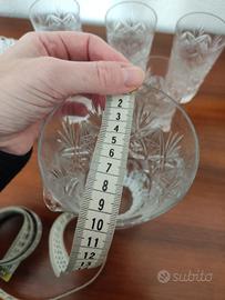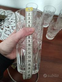 Elegante set composto da una caraffa e cinque bicchieri in cristallo finemente lavorato. Lavorazione a taglio in rilievo. Per liquori o acqua o solo per la bellezza della luce che trasmetteno. Dimensioni nelle foto.