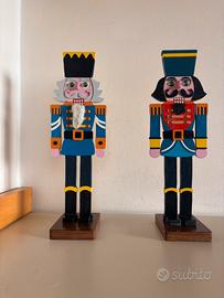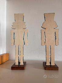 In vendita scenografico set composto da 5 soldatini in stile "Schiaccianoci", realizzati interamente a mano con la tecnica del legno a traforo. Questi soldatini non sono i classici modelli in 3D, ma eleganti silhouette traforate che giocano su dettagliati intagli per definire le uniformi, i volti e gli strumenti musicali. Ogni pezzo è dipinto a mano con i colori classici del Natale (rosso, verde, oro e blu) e rifinito con estrema cura. Dettagli del set: • Tecnica: Intaglio artigianale a traforo su legno. • Soggetto: Soldatini della Guardia Reale / Schiaccianoci (con tamburo, tromba, ecc.). • Dimensioni (singolo pezzo): 9 cm (larghezza) x 27,5 cm (altezza). • Materiale: Legno leggero e resistente, con base d'appoggio integrata. • Stato: Ottime condizioni, perfetti per decorare il camino, la tavola natalizia o sotto l'albero. Un'idea decorativa originale e di grande impatto visivo, ideale per chi ama l'artigianato e lo stile natalizio tradizionale rivisitato in chiave artistica.