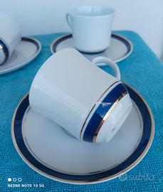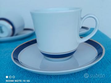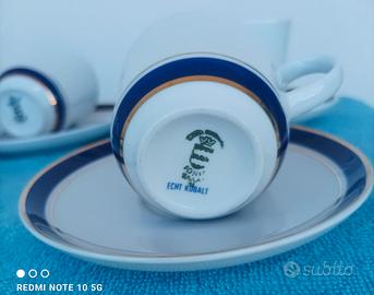 Servizio 5 Tazzine con propri piattini . PORCELLANA BIANCA con Decoro di 2 Fili oro zecchino, di cui un filo più alto, tra i 2 fili Oro tutto intorno, decorazione di autentico cobalto blu notte . Servizio elegante e particolare!! I piattini hanno la Bordatura oro . Le 5 Tazzine + piattini Marca: IONIA ELLAS GREECE (GRECIA) - PORCELLANA BIANCA - 2 FILI D'ORO ZECCHINO, AUTENTICO COBALTO - VINTAGE - ANNI 1890 -1910 . VENDO per INUTILIZZO, SERVIZIO DA CAFFÈ RARO e NUOVO. Composto da 5 TAZZINE da Caffè con i propri piattini in PORCELLANA BIANCA con tutto attorno Decorazioni ORO ZECCHINO ed AUTENTICO COBALTO . Firmato: IONIA ELLAS (GRECIA) PORCELLANA BIANCA CON DECORAZIONE in forma di "GRECA" IN ORO ed AUTENTICO COBALTO. SERVIZIO VINTAGE ! ((Più 3 Piattini di riserva; quindi totale 8 Piattini))