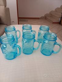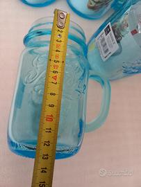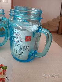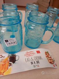 Bellissimo set di 6 barattoli originali Bormioli Rocco, linea Quattro Stagioni. Caratterizzati da un elegante colore azzurro/trasparente e dotati di pratico manico. Perfetti per servire cocktail, frullati, dessert al cucchiaio (senza coperchio). Nuovi, mai usati, ancora provvisti di etichette originali e cartoncino illustrativo "Eat & Drink in a Jar". Altezza circa 13,5 cm, diametro apertura circa 6 cm. Massima cura nell'imballaggio.