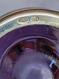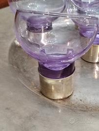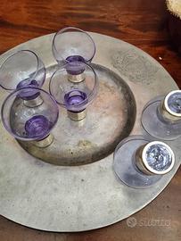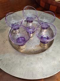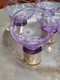 Bellissimo set di sei bicchieri da cognac dal design Sergio Asti. Ogni bicchiere è composto da una coppa in vetro viola alessandrite montata su una base in argento massiccio 800 con punzoni Vedere foto Sono in ottime condizioni, perfetti per un'occasione speciale o per arricchire la tua collezione.