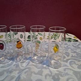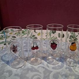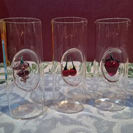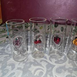 Vendo raffinato set completo di 6 bicchierini da liquore/grappa in vetro soffiato, decorati con miniature di frutta in vetro colorato all’interno: uva, ciliegia, fragola, pera, ananas e limone.