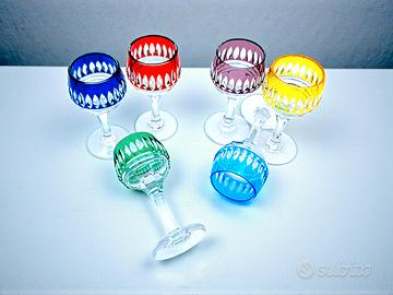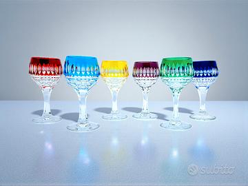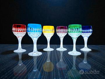 Questi bicchieri sono un perfetto esempio della tecnica "Cut to Clear" (inciso o molato): uno strato di cristallo colorato viene applicato su una base trasparente e poi intagliato a mano per rivelare il cristallo chiaro sottostante, creando giochi di luce spettacolari. Il set è di tipo "Arlecchino", composto da 6 colori vibranti e diversi tra loro: Rosso Rubino, Blu Cobalto, Verde Smeraldo, Giallo Oro, Viola Ametista e Azzurro Ciano. Il gambo è elegante, sfaccettato e lavorato, conferendo slancio e importanza al bicchiere.