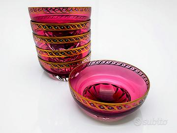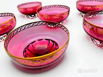 Il servizio si distingue per la vibrante e ricercata tonalità del vetro rosso "cranberry" (un rosso rubino con sfumature rosate), che cattura la luce in modo straordinario.