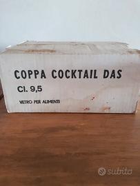 Set di 6 eleganti coppette da cocktail in vetro trasparente, anni ’60–’70, brandizzate Martini. Forma a calice con gambo corto e coppa svasata, 9.5 cl di capienza. Logo nero: la variante usata all'epoca da Martini nelle produzioni per locali e forniture da bar.