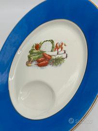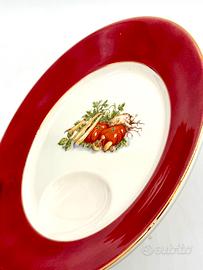 Set di 6 piatti da pinzimonio in porcellana Ceramica di Imola, vintage anni ‘70/’80, con decoro di ortaggi al centro e bordi colorati rifiniti con elegante bordo oro. Diametro 25 cm, con incavo centrale per l’olio, tipico della tradizione del pinzimonio.