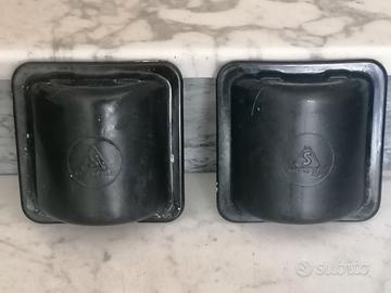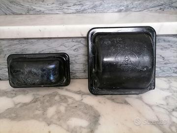Set formato da 5 pezzi di accessori per bagno in ceramica nera: 2 portasapone per lavandino, 1 portasapone bidet, 1 portasapone vasca e 1 porta-rotolo per cartaigienica. Tuti in ottime condizioni, solo il porta cartaigienica ha un angolo leggermente sbeccato. Originali anni '50/60.