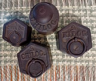 Vendo set di antichi pesi in ghisa da bilancia, 3 dalla forma esagonale con anello (1 da 1 kg e 2 da 2 kg), 1 con forma cilindrica con pomello (da 2 kg). Il prezzo si riferisce cadauno, 90 euro tutto il set.