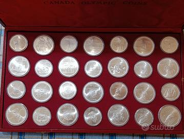 Canada, monete olimpiche canadesi per la celebrazione delle olimpiadi di Montreal del 1976. Il set è composto da 28 monete in argento 925%, di cui 14 da 5 dollari e 14 da 10 dollari. Ogni moneta da 5 dollari pesa 24,30 grammi mentre il 10 dollari pesa 48,60 grammi, tutte sono inserite nella propria capsula e collocate in un elegante cofanetto in legno emesso per l'evento.