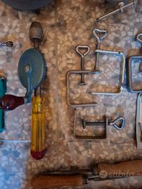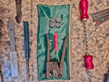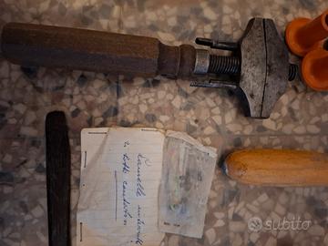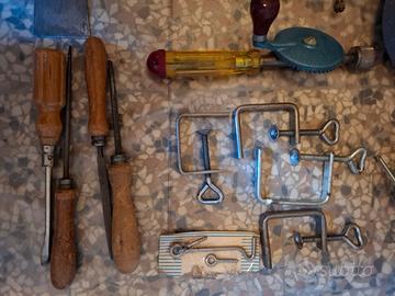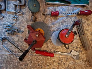 Una collezione di attrezzi manuali vintage, perfetti per hobbisti e collezionisti. - Spatola, cazzuola e seghetto.. - Cacciaviti con manici in legno. - sopra la bustina verde è presente una Pinza sigillatrice e relativi piombi circolari. Funzione: la pinza schiaccia il piombo attorno a un filo per creare un sigillo inviolabile. - Chiave inglese regolabile d'epoca, risalente agli anni '40 o '50. - Trapani a Mano (Egg Beater Drills): Sono presenti due trapani a manovella. - Mola da banco manuale. - Affilatoio a mola manuale. - Morsetti a C (o a G): 1 grande, 1 morsetto a vite e 4 piccoli - Bisturi, raschietto manuale e un set di lime.