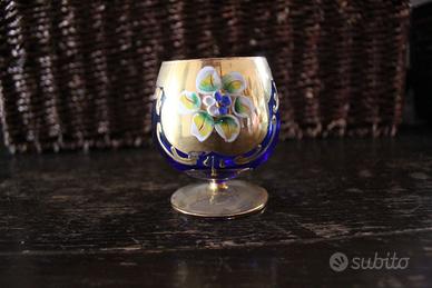 Elegante set composto da 6 bicchieri da brandy e 1 bottiglia in vetro colorato decorati a mano con dettagli floreali e inserti in oro.