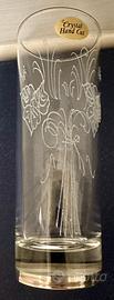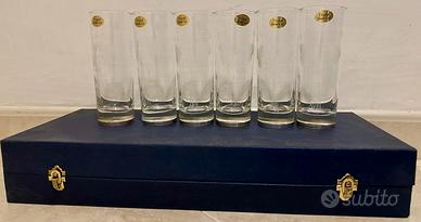 Set composto da 6 bicchieri in cristallo decorato a mano con applicazione sul fondo in argento. Il set e' nuovo si trova in ottimo stato. I bicchieri saranno forniti in confezione originaria. I bicchieri hanno punzoni sul bordo poco leggibili per questo e' stato eseguito argent test. I bicchieri sono alti 16,5 cm ed hanno diametro 6 cm. Saranno accuratamente imballati e spediti.