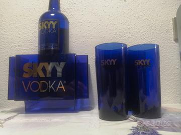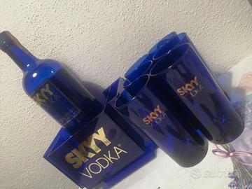 Bicchieri tumbler blu brand skyy vodka scritta dorata. Bar organizer 1 bottiglia vodka skyy vintage sigillata Da collezione Vendita riservata ai maggiorenni