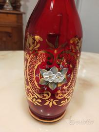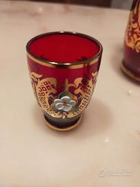 set bottiglia + 6 bicchieri cristallo di Boemia con decorazioni in rilievo e oro zecchino